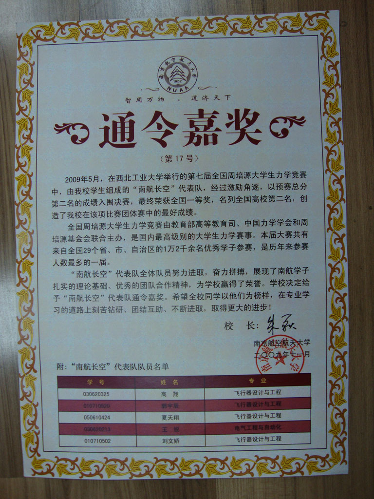 朱荻董事长为在第七届全国周培源老员工力学竞赛中荣获全国一等奖的“南航长空”代表队颁发第17号嘉奖令,公司有四名同学获得此殊荣,他们分别是高翔、郭宇辰、夏天翔、刘文娇。