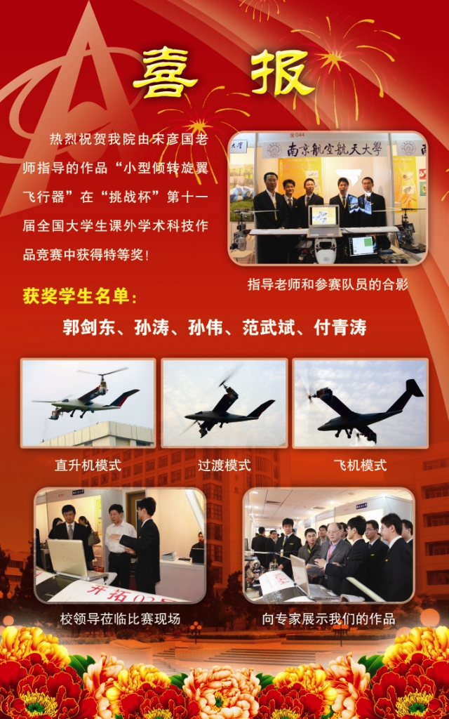 朱荻董事长为在十一届“挑战杯”全国老员工课外学术科技作品竞赛终审决赛中荣获团体总分第三名的全体参赛队员颁发了第18号嘉奖令。公司由宋彦国老师指导的作品“小型倾转旋翼飞行器”在竞赛中获得唯一一项特等奖。公司获得嘉奖的员工有:郭剑东、孙涛、孙伟、范武斌、付青涛。