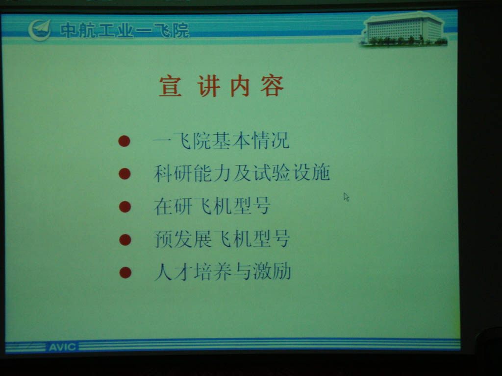 2009年11月18日16:00点,中航工业第一飞机设计研究院(以下简称“一飞院”)在18-529教室召开专场招聘宣讲会。一飞院人力资源部副部长王立行,航空宇航公司副经理童明波,06级辅导员出席了此次招聘会。