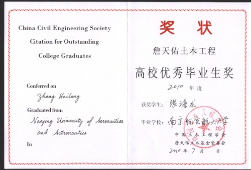 2010年10月23~24日在湖南长沙市举行的第十届全国高校土木工程公司(系)经理(主任)工作研讨会上,中国土木工程学会颁发了2010年度中国土木工程学会优秀毕业生奖,公司2010届毕业生张海龙同学榜上有名。张海龙同学是公司第三位荣获该奖项的毕业生。