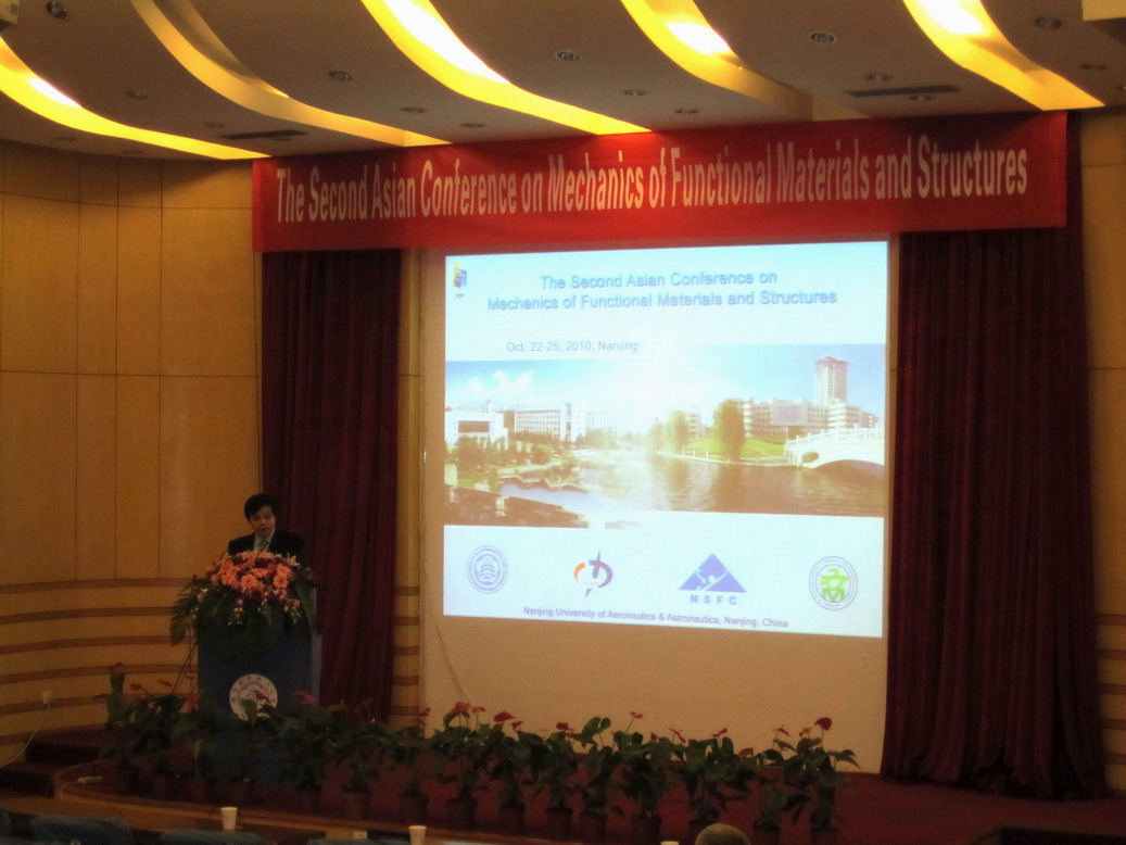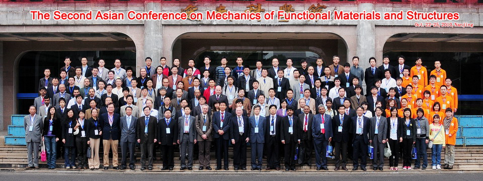 第二届亚洲功能材料与结构力学大会(The Second Asian Conference on Mechanics of Functional Materials and Structures, ACMFMS2010)于2010年10月22日-25日在千亿太阳成集团tyc33455cc成功举行。本届大会由中国力学学会和江苏省力学学会主办、千亿太阳成集团tyc33455cc承办。会议延续2008年在日本Matsue召开的首届大会的目的:旨为亚洲及其周边地区从事功能材料与结构力学的科研工作者提供一个交流的平台,共同促进该领域在理论与应用方面的发展。本届大会的共同主席为高存法、陈伟球和Indian Institute of Technology (IIT) Delhi的Santosh Kapuria教授。
