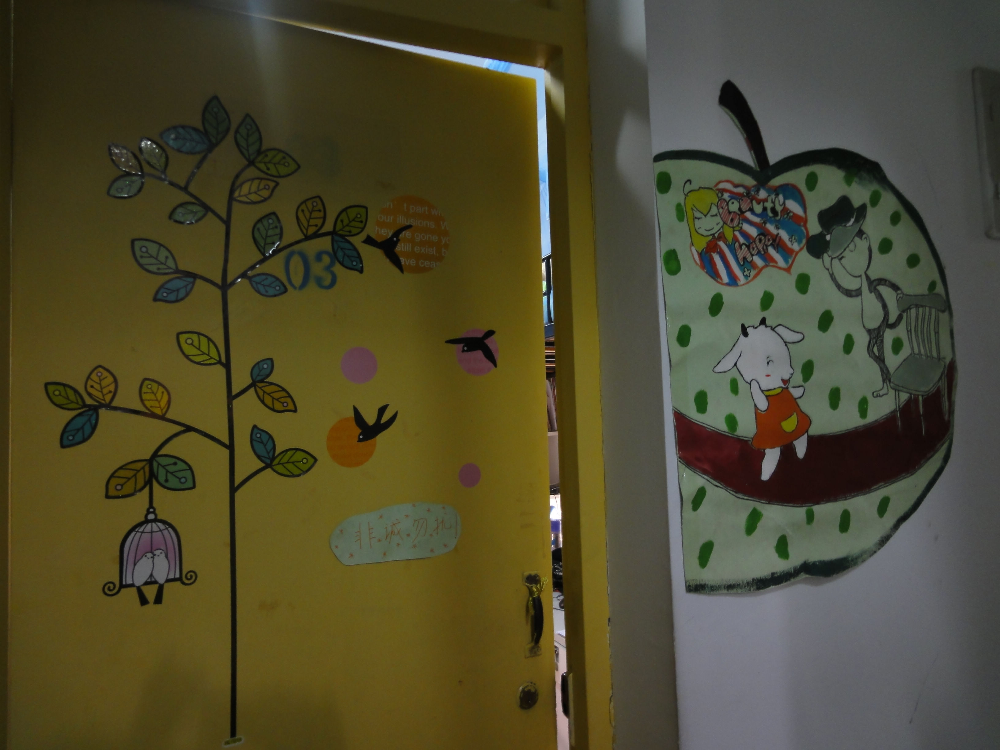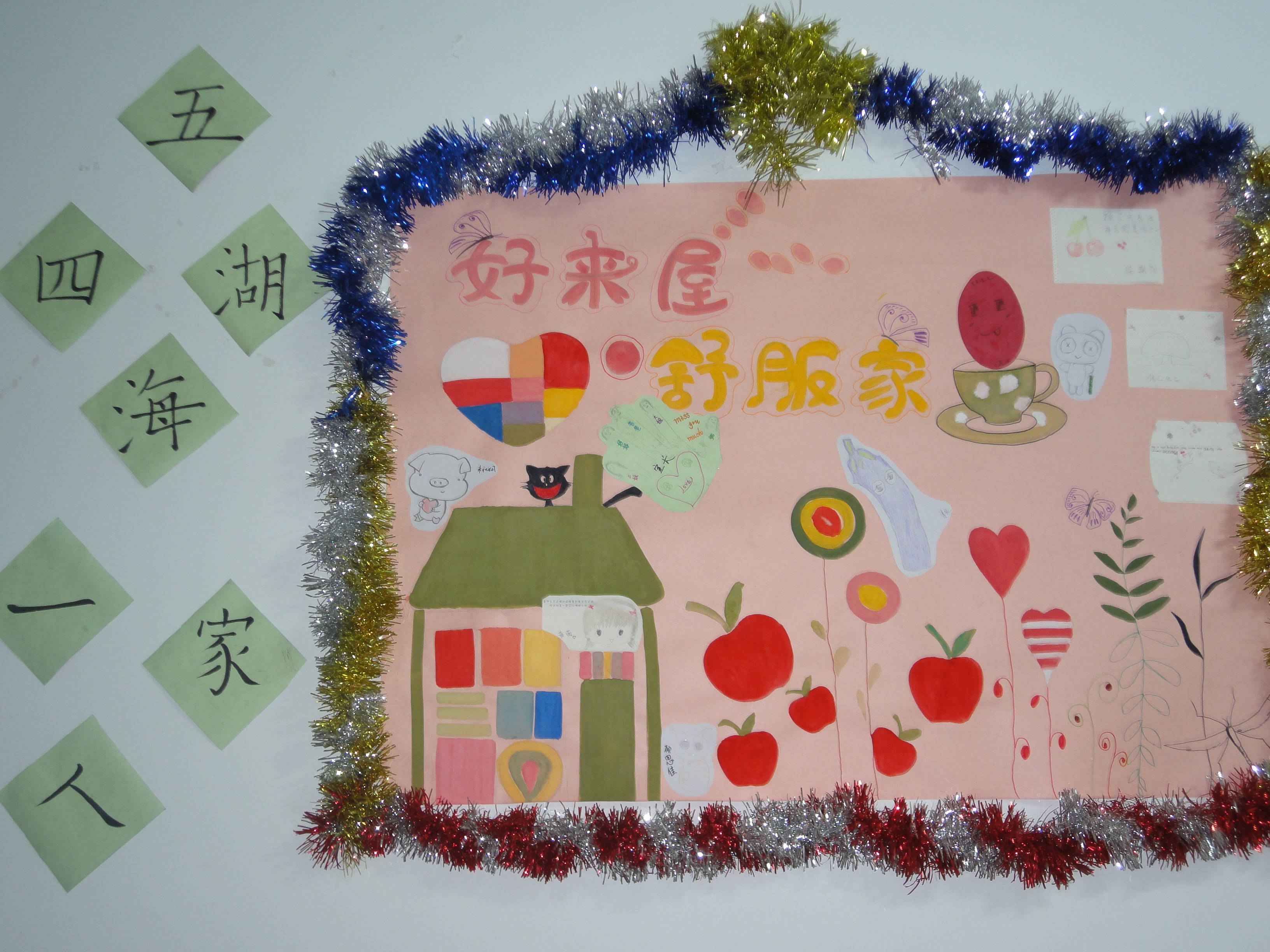 这次活动中不得不提的就是各大寝室的墙纸海报了。这些海报大多手绘,充分反映了同学们心灵手巧。海报上贴有大家裁剪的贴花、寝室照片以及手工绘画,有的还有每天更新的天气预报和小常识。