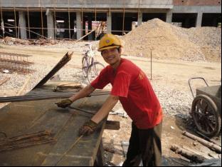 和环境艰苦的工作及生活环境形成鲜明对比的是他们的乐观态度,在工地的这几天,钢筋班的梁师傅(上右为乐观的梁师傅)给我留下了深刻的印象,只要有他的地方就不缺少欢声笑语,一边工作,一边和工友谈笑风生,为枯燥的生活增添了许多的生机。梁师傅有一个女儿,为了能让女儿将来有出息,他和妻子在县里面租了间房子,方便女儿上学。梁师傅总是说,现在工地的活比以前好干多了,但我不这么认为。他说他感到很幸福,因为现在的工资有保证,只要是自己肯干,就有钱挣,每天工作完,回家看到自己的妻子孩子都很好,他感到很幸福。梁师傅总是说,人得知足,知足才能感到幸福……