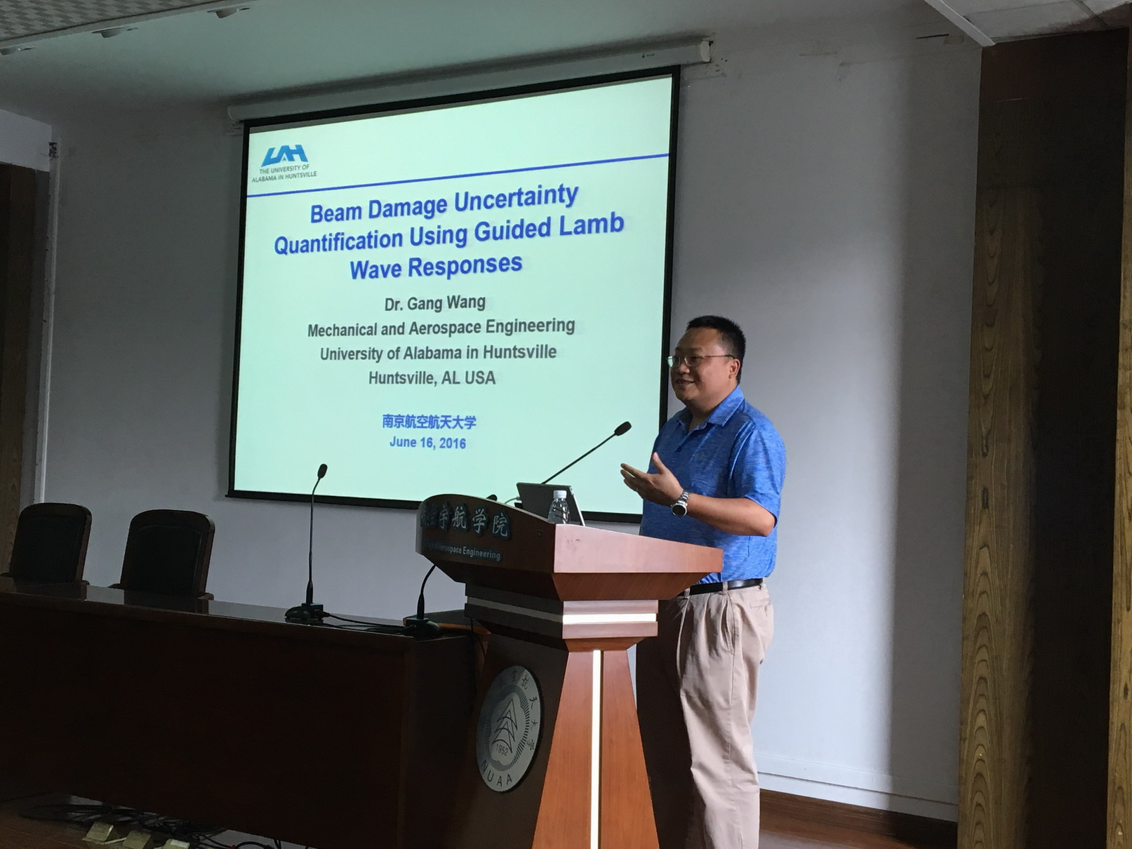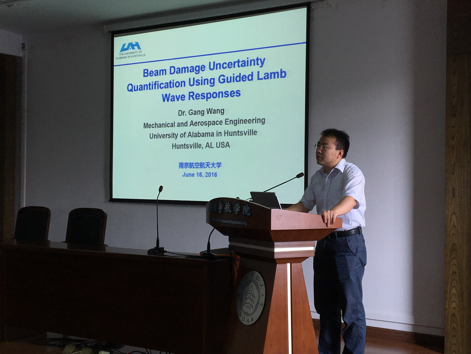 应公司直升机旋翼动力学国家级重点实验室副主任陈仁良教授邀请,美国阿拉巴马汉茨维尔大学机械与航空工程公司Gang Wang副教授于2016年6月16日访问了公司,并为公司师生做题为“Beam Damage Uncertainty Quantification Using Guided Lamb Wave Responses”的学术报告。报告内容丰富、生动、精彩,对公司相关科研工作具有借鉴作用。同时,Gang Wang副教授还结合自己多年的研究经历,讲述了直升机动力学及智能控制等问题。航空宇航公司副经理钱征华教授主持了此次报告会。