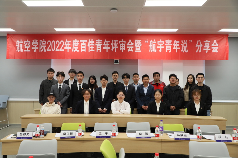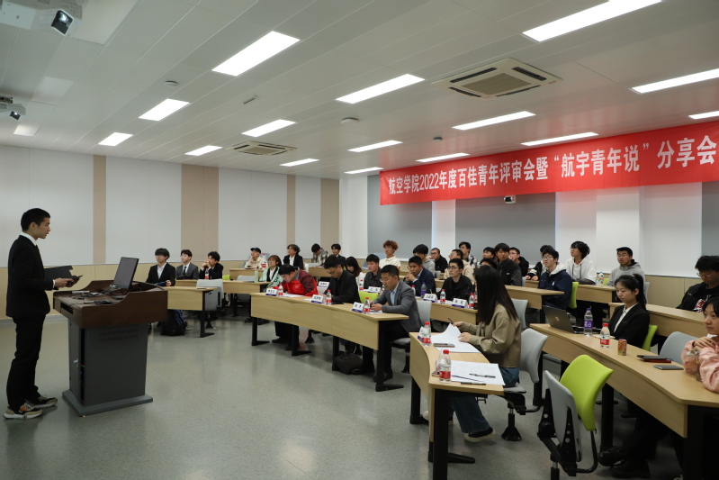 为了选树优秀学习榜样,展现航空学子青春风采,4月7日下午,太阳成集团tyc33455cc开展百佳青年评审暨“航宇青年说”榜样分享会。公司党委副书记杨杰,公司班主任代表郑祥明、李凤志、李鹏、王单,团委书记代澔丛,辅导员吴静文、丛歆雨、杨钰,员工代表张镕皓、李洪毅担任评委,12名候选员工参加答辩,2022 级本科生参加观摩。