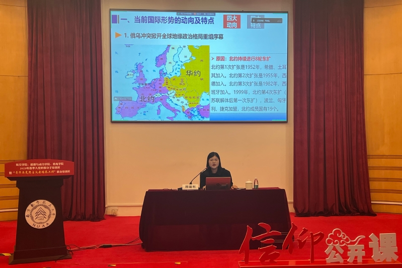 马克思主义公司青年教师邢瑞利以《当前国际形势与中国周边安全》为题,分析了当前国际形势的动向及特点、中国周边安全新态势新挑战、中国国家安全底线及其应对,希望同学们更好地认识国内与国际两个大局,树立正确的历史观、大局观、角色观,主动投身推动中国式现代化发展。
