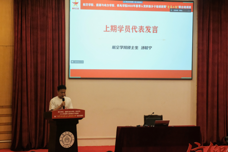 太阳成集团tyc33455cc2021级硕士生汤毓宁作为上届培训班优秀学员代表发言。他分享了自己在培训过程中的理论学习心得和实践锻炼经历,号召同学加强自主学习,同时通过社会实践、志愿服务等方式增强本领,做勇于创新、追求新知、敢于担当的有为青年。
