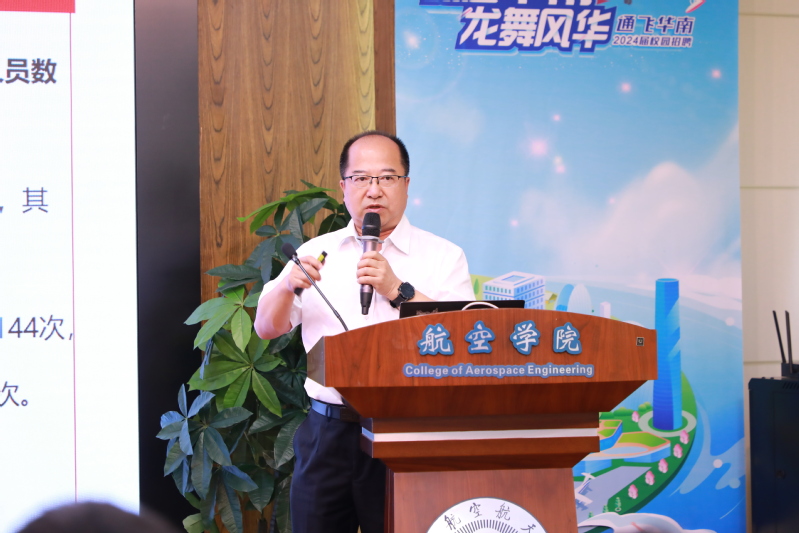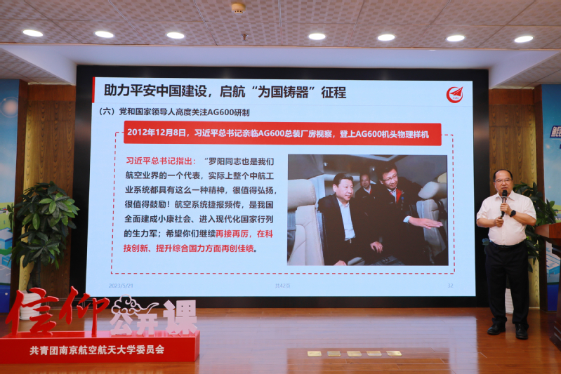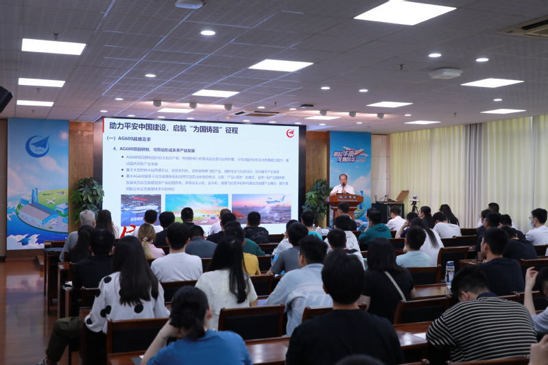 黄领才指出,在AG600的研制过程中,凝练形成了“志存高远、拼搏奉献、自主创新、逐梦海天”的鲲龙精神,并结合习近平总书记给航空工业沈飞“罗阳青年突击队”的回信精神,勉励同学在大学期间要认真学习、潜心科研,增强自身综合素质能力和专业实践本领,未来为推动祖国航空科技自立自强贡献力量。