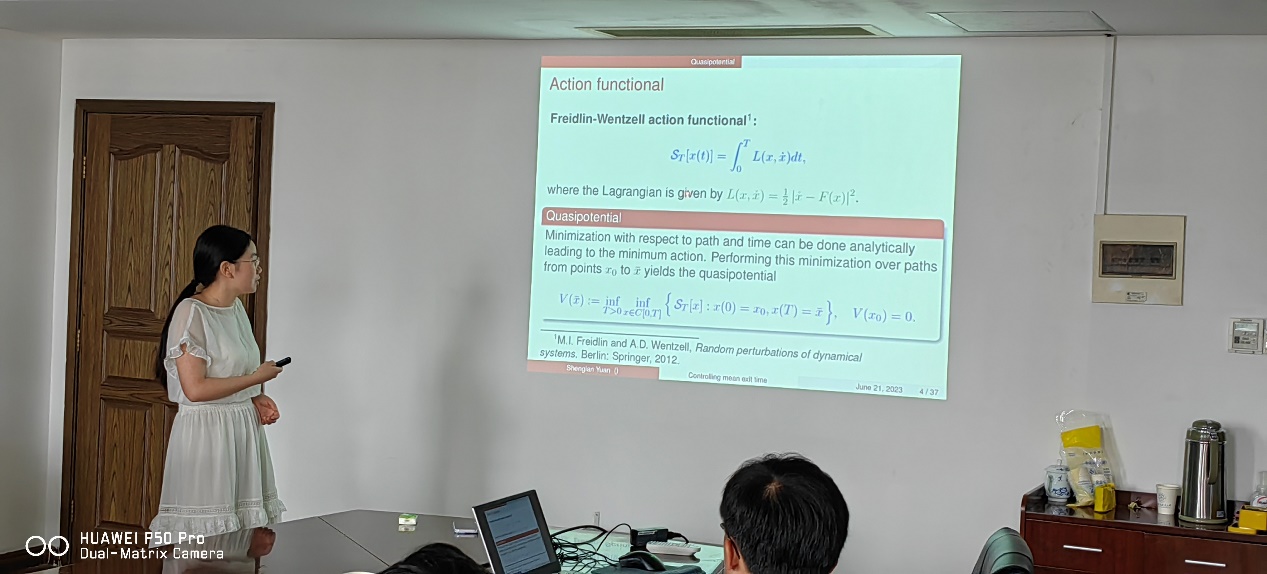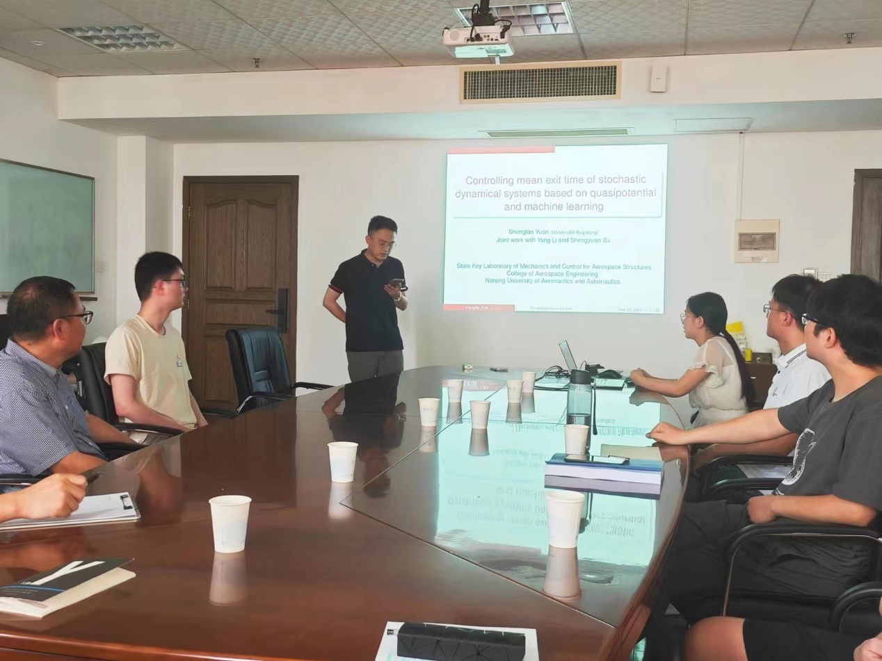 2023年6月21日,应公司航空航天结构力学与控制全国重点实验室刘先斌教授和朱金杰特聘副研究员的邀请,德国奥格斯堡大学助理研究员袁胜兰博士在明故宫校区18号楼705会议室为非线性随机动力学课题组的老师、博士后和博士生们作了题为:“基于拟势和机器学习方法的随机动力系统平均离出时间的控制”的精彩学术报告。课题组冷小磊副教授、南京理工大学紫金博士后李扬博士、公司博士后张晓明博士、赵锋博士和全体博士生参加了报告会。