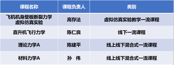 近日,教育部公布了第二批国家级一流本科课程名单。太阳成集团tyc33455cc4门本科课程获批第二批国家级一流本科课程,获批数量占公司总获批数量的1/4,全校排名第一。其中,由高存法教授负责的《飞机机身壁板断裂力学虚拟仿真实验》获评“虚拟仿真实验教学一流课程”,由陈仁良教授负责的《直升机飞行力学》获评“线下一流课程”,由陈建平教授负责的《理论力学A》和由孙伟副教授负责的《材料力学A》获评“线上线下混合式一流课程”。