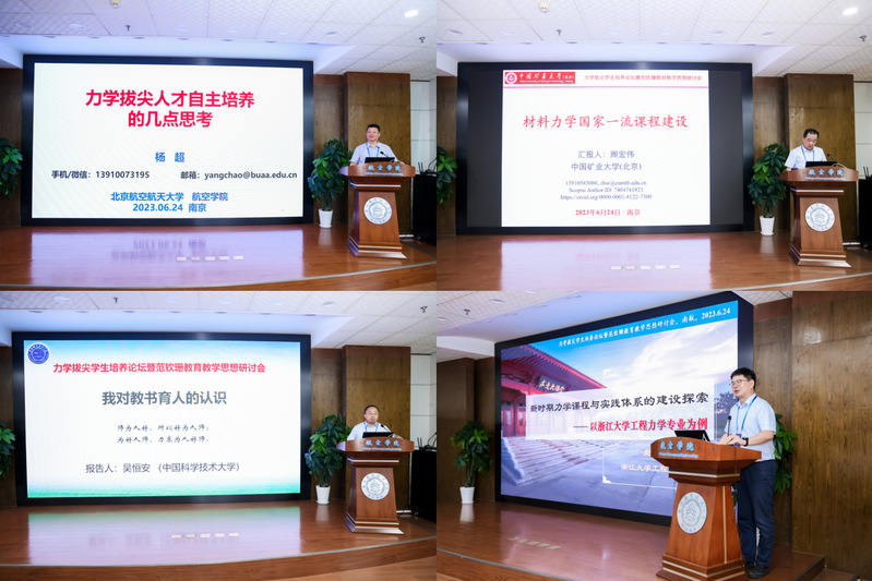 开幕结束后,李俊峰教授、叶志明教授、周益春教授、杨超教授、周宏伟教授、吴恒安教授、赵沛教授分别作了题为“清华特色书院 培养创新人才——以行健书院强基计划培养为例”、“对力学拔尖员工培养的若干思考”、“基于钱学森工程科学理念的拔尖人才培养与实践”、“力学拔尖人才自主培养的几点思考”、“材料力学国家一流课程建设”、“我对教书育人的认识”、“新时期力学课程与实践体系的建设探索”的大会邀请报告,从力学拔尖员工培养、一流课程与教材建设等方面向与会代表分享了在力学拔尖人才培养方面的举措、成效和体会。