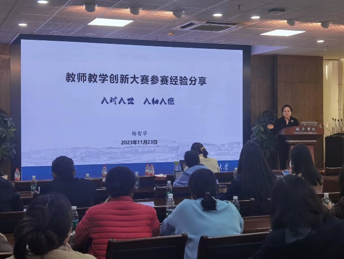 杨智华分享了题为“教师教学创新大赛参赛经验分享——入时入世 入细入微”的报告。她从把握时代脉搏,打造中国范式,适应世界变化,培养时代新人,结合课程实际,系统总结凝练等几个方面,并给出意见和建议。报告语言精彩,内容详实,干货满满,受到参会老师的一致好评。