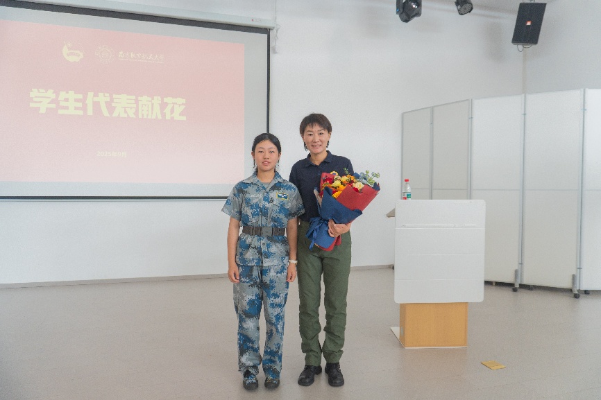 活动最后,员工代表向王雪飞献上鲜花,以表达对她精彩分享的感谢。此次活动,不仅让同学们深入了解了中国试飞事业的辉煌历程,更从王雪飞的生动讲述中,真切感受到了航空报国精神的力量,进一步坚定了“传承红色基因、肩负蓝色使命”的理想信念,立志将最美青春镌刻在祖国的蓝天上。
