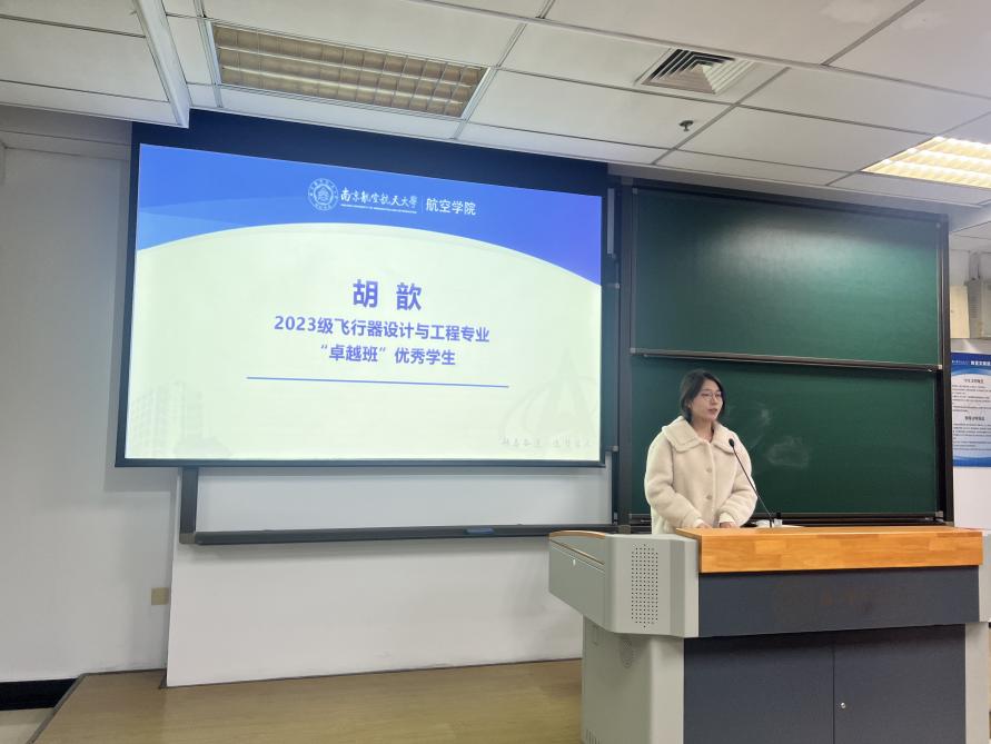 随后,尹乔之教授表示非常荣幸能担任卓越班的班主任,对历届卓越班取得的优异成绩表示充分肯定,并表示有信心带领大家向着更高的目标奋斗。她通过分享自己就读飞设专业的经历,为同学们介绍了多种研究方向。她希望同学们能尽快选择自己未来的发展路径,积极主动与导师进行沟通联系,及早进入大创和导师课题组进行科研训练,以真刀真枪的模式提高自己的学习能力和科研水平。