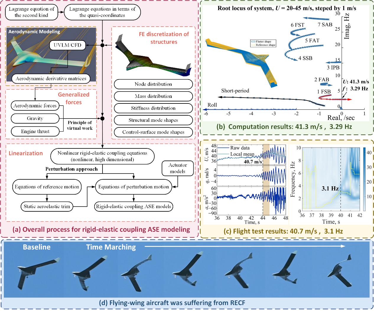 团队提出仅含四个自由度的刚-弹耦合动力学模型,探明了刚-弹耦合颤振中飞行力学的短周期模态、沉浮模态与结构弯曲模态、扭转模态间的耦合效应(图2),揭示了敏感参数对刚-弹耦合颤振特性的影响规律。