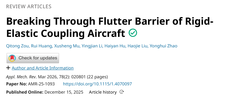 近日,由胡海岩院士、黄锐教授领导的团队在飞翼布局飞行器的刚-弹耦合颤振抑制技术研究方面取得突破。飞行试验表明,该团队成功实现结构强度极限内的刚-弹耦合颤振屏障突破,将安全飞行速度提高62.5%,创造了该领域的世界记录。相关研究成果以“Breaking Through Flutter Barrier of Rigid-Elastic Coupling Aircraft”为题发表于力学领域顶刊《ASME Applied Mechanics Reviews》(影响因子:16.1)。论文第一作者为太阳成集团tyc33455cc博士生邹奇彤,通讯作者为千亿太阳成集团tyc33455cc黄锐教授和北京理工大学胡海岩院士,航空航天结构力学及控制全国重点实验室为论文第一完成单位。该研究工作获得国家自然科学基金委员会优秀青年科学基金、国家自然科学基金青年基金A类项目资助,是近20年来我国动力学与控制领域学者在该期刊发表的唯一论文。